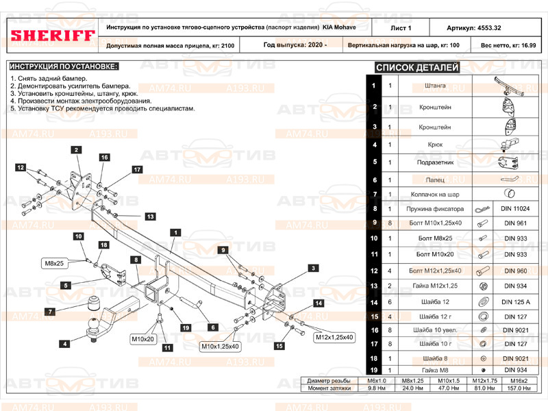 Фаркоп Шериф 455332 (Sheriff 4553.32, Sheriff SF.4553.32) для Kia Mohave 2020+ предназначен для буксировки прицепа максимальной массой 2100 кг с вертикальной нагрузкой на шар до 100 кг. Фаркоп поставляется без электрики. Для подключения к автомобилю необходимо использовать электрику с блоком согласования. Установка фаркопа Шериф 455332 на автомобили Kia Mohave 2020+ производится согласно инструкции в сервисном центре Автомотив-Челябинск.